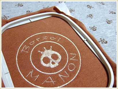 なので袖はドクロ模様と合わせて茶色のミニ裏毛。身頃に刺繍をするのはうるさいかなぁ~と思ったので袖にワッペン風の刺繍をしてみました。