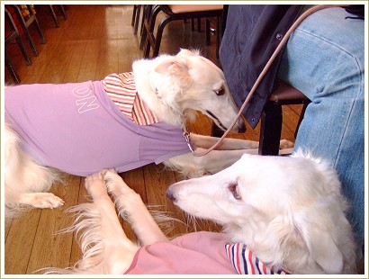 うちのボルゾイ、特に風歌は小さな頃から強い者(真音)には巻かれろという教訓を日々叩き込まれて育ったので、彼の辞書から「抵抗」という文字はすっぽりと抜け落ちたものと思われます。(爆)