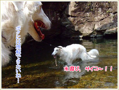 お姉ちゃんはず~っと水に入るチャンスを狙ってたんだよ。とうとうおかーさんが折れて水遊びの許可が出たんだ。ボクはいっくら勧められても真っ平御免だけどね。