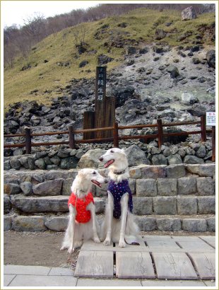 途中にあった「殺生石」っていうところをお散歩したよ。ここは温泉から戻ってきたおとーさんとおかーさんと同じ臭いがぷんぷんしたんだ。これっていったい何の臭いなんだろう?