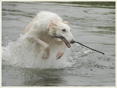 それがカヌー犬講習を受けさせたばっかりに水遊び大好き!なお水系ボルゾイに変身しちゃって…。(^-^ゞ