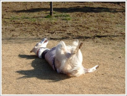 満足したら、やっぱりこれ。頭の先から尻尾の先まで枯れ芝生だらけ~。