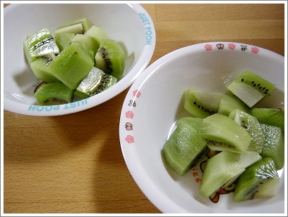先日、蓼科へ行ったときに途中のSAでキウイを買いました。1袋10個入りで200円!なんてリーズナブルなの~。さっそくむいて食べてみると…