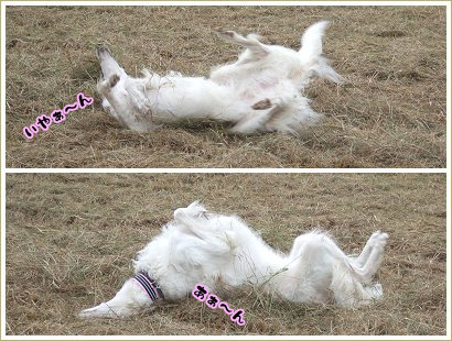 今日は走るよりも転がりたい気分らしい。草の実がなさそうだったから油断してたよ~。後でチェックしてみたらネバネバ系が!(軽いネバネバ系(どんなだ?)でまだ助かった…。)
