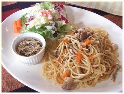本日のパスタはとび子とキノコのペペロンチーニ。労働した後のご飯はウマいねぇ~。